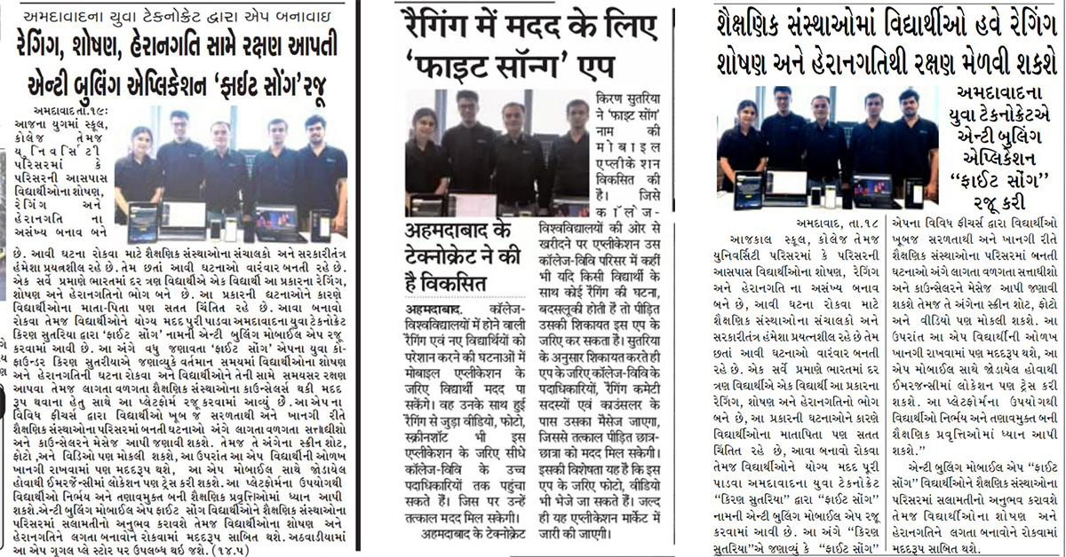 Citta Solutions’ unimpeachable platform for anti ragging is recognized by more than 5 newspapers like Rajasthan Patrika, Page 5, 19th April’19, Gujarat Today, Page 4, 19th April’19, Akila, Page 17, 19th April’19, Page 5, Rajasthan Patrika, 19th April’19, Page 4, Gujarat Today, 19th April’19, Page3, Sandesh, 21st April’19.