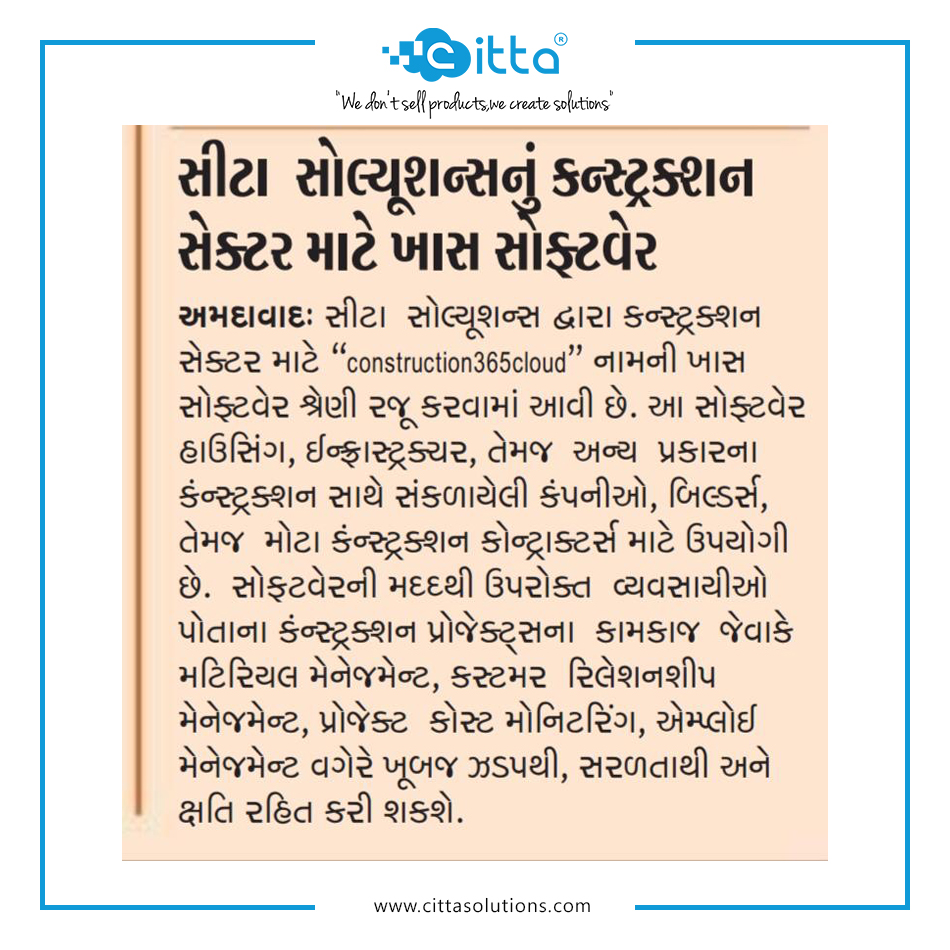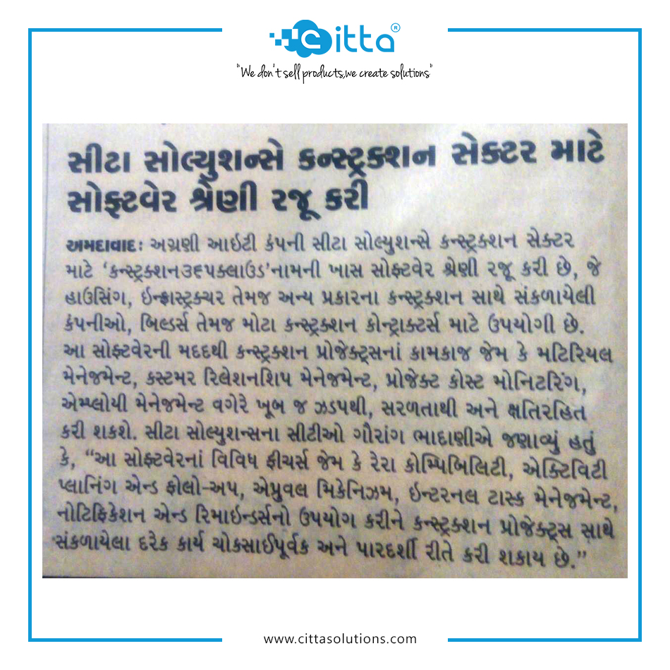 November 21, 2019By newscittaCategorized : News Developed User Friendly Construction Software Citta Solutions Pvt. Ltd. has developed first advanced software for construction and real estate business and it is acknowledged by PR – Page 2, The Economic Times, 20th Nov’19, PR – Page 8, Nav Gujarat Samay, 20th Nov’19